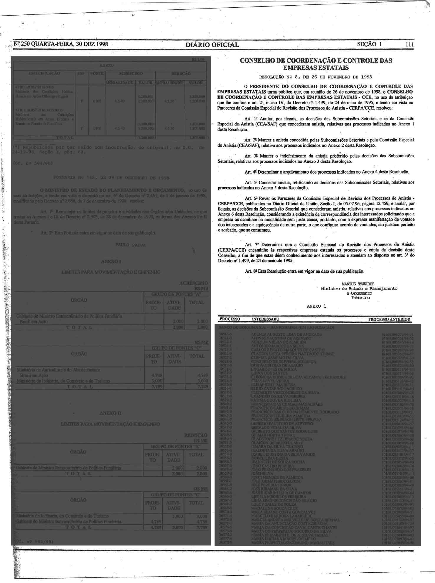 Publicada no Diário Oficial - Edição de nr. 250 em 30/12/1998 na Seção 1,